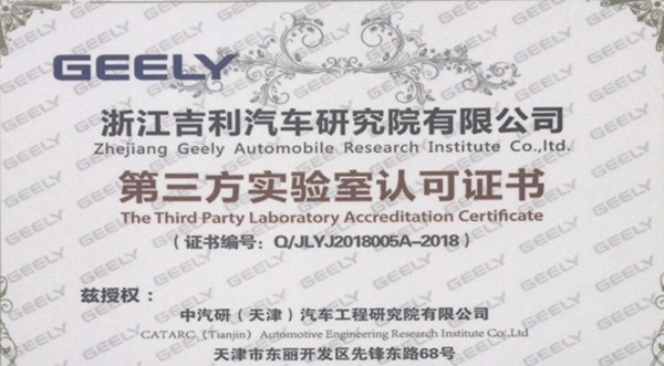 2018年6月14日,浙江吉利汽車(chē)研究院有限公司(以下簡(jiǎn)稱(chēng)“吉利研究院”)召開(kāi)“第三方委外管理辦法宣貫”會(huì )議。中汽研(天津)汽車(chē)工程研究院有限公司(以下簡(jiǎn)稱(chēng)“璦?!保┦苎麉⒓颖敬螘?huì )議,并在會(huì )上獲得吉利研究院試驗中心頒發(fā)的“浙江吉利汽車(chē)研究院有限公司·第三方實(shí)驗室認可證書(shū)”。
